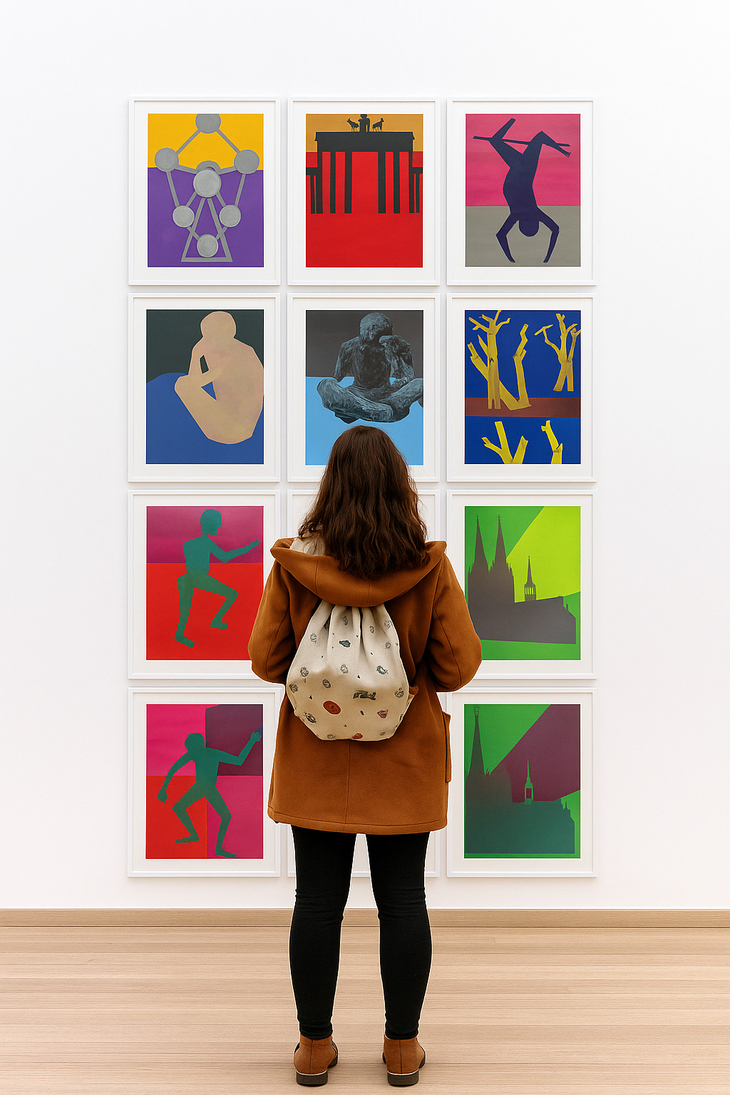 Von einer kontrastgebenden, ein- oder zweifarbigen Hintergrundkulisse (Farbfeldmalerei: nach oben und unten gliedernde, segmentierende Horizontlinie) setzen sich Motive ab gleich Silhouetten, flächigen Schablonen-Phantome, Piktogramme, gleich klarsichtigen Erinnerungen, Grundrisse zurechtschleifende Fernansichten oder wie einprägsame Schattenrisse.